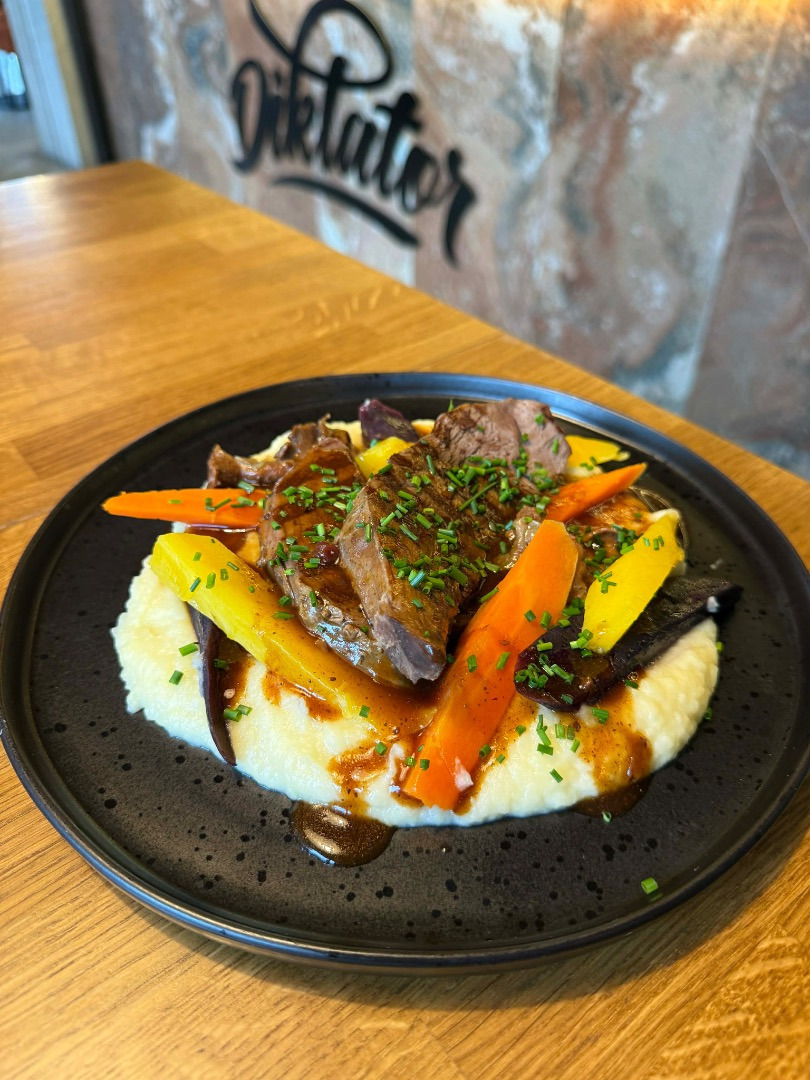 180g 100% odležaný hovädzí chuck roll, hľúzovková majonéza, 3x syr (cheddar, eidam, volovec), slaninový chips, restovaná cibuľa, rukola