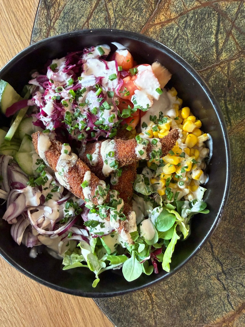 Mista šalát, francúzsky dressing, jemne pikantné kuracie stripsy