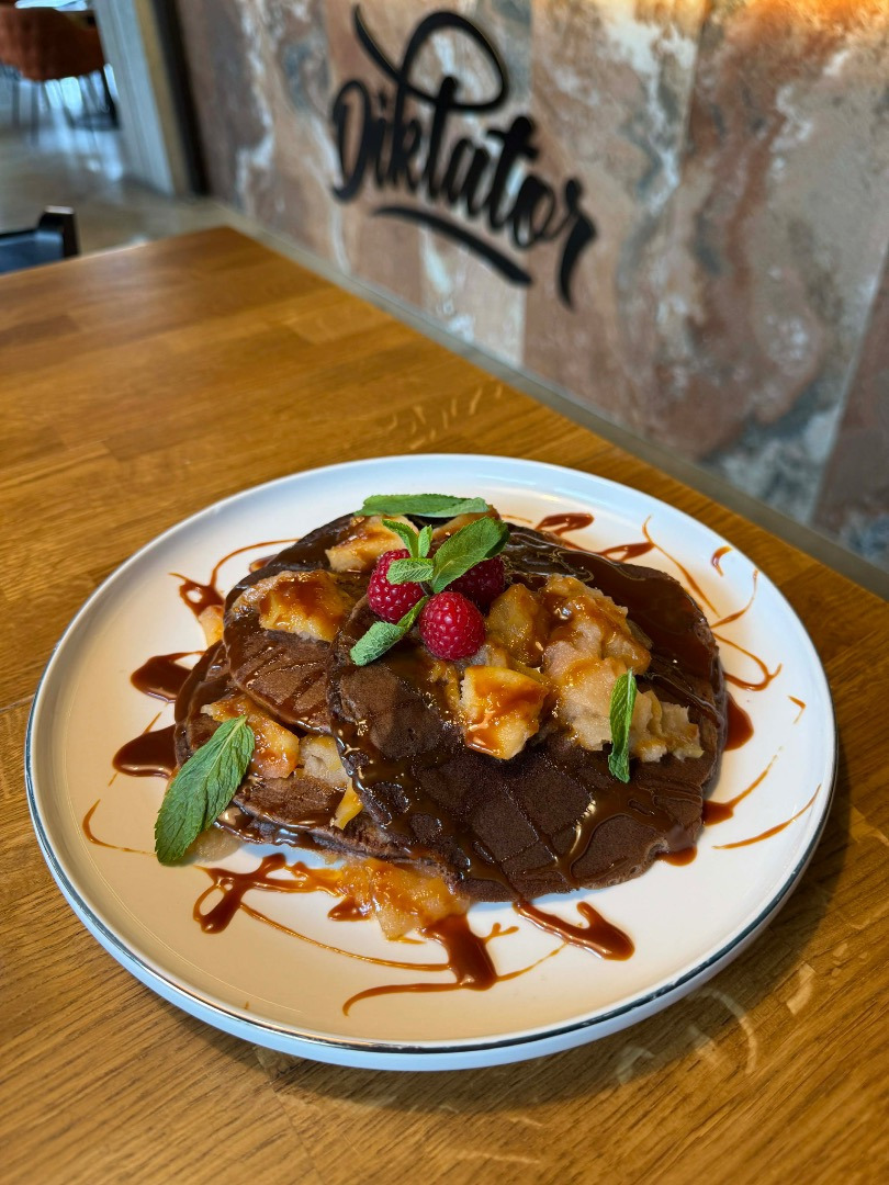 Kakaové lievance so škoricovými jablkami a slaným karamelom
