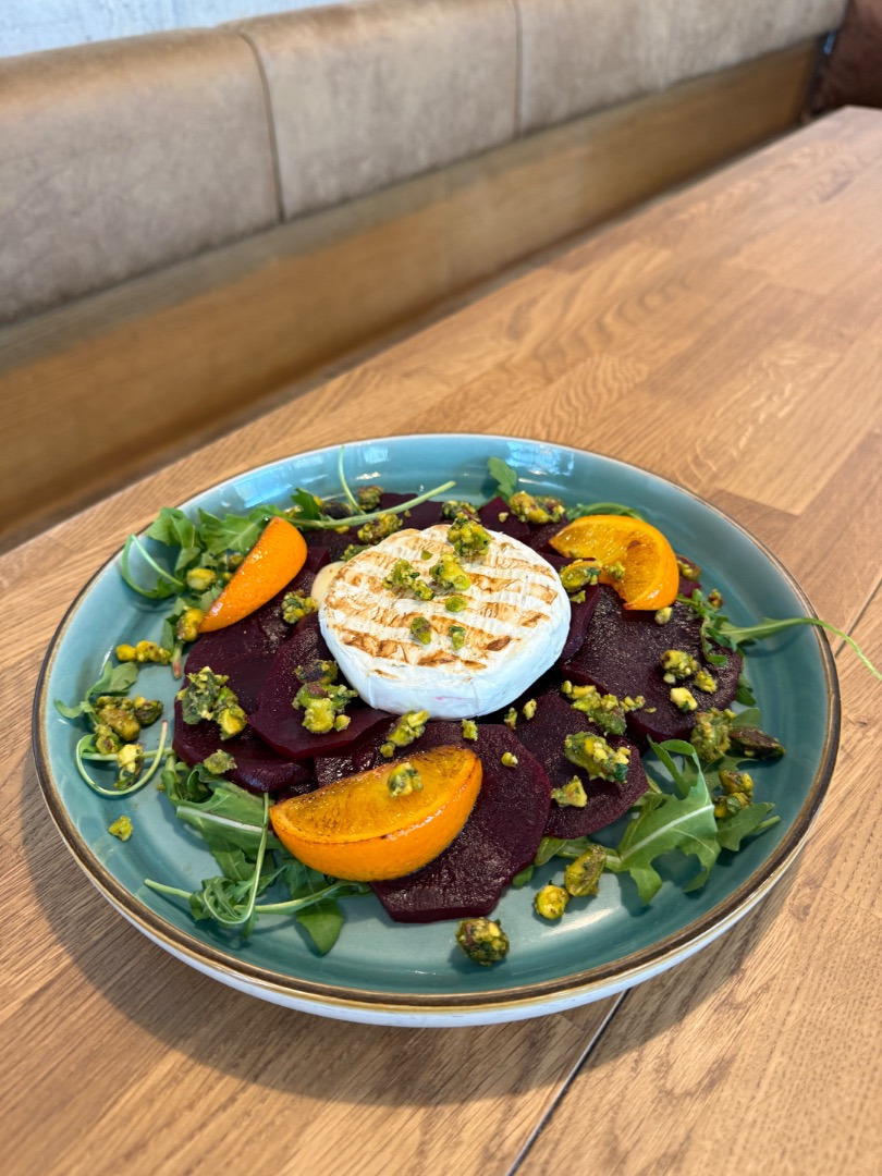 Šalát z pečenej repy, grilovaný hermelín s pistáciovou gremolatou