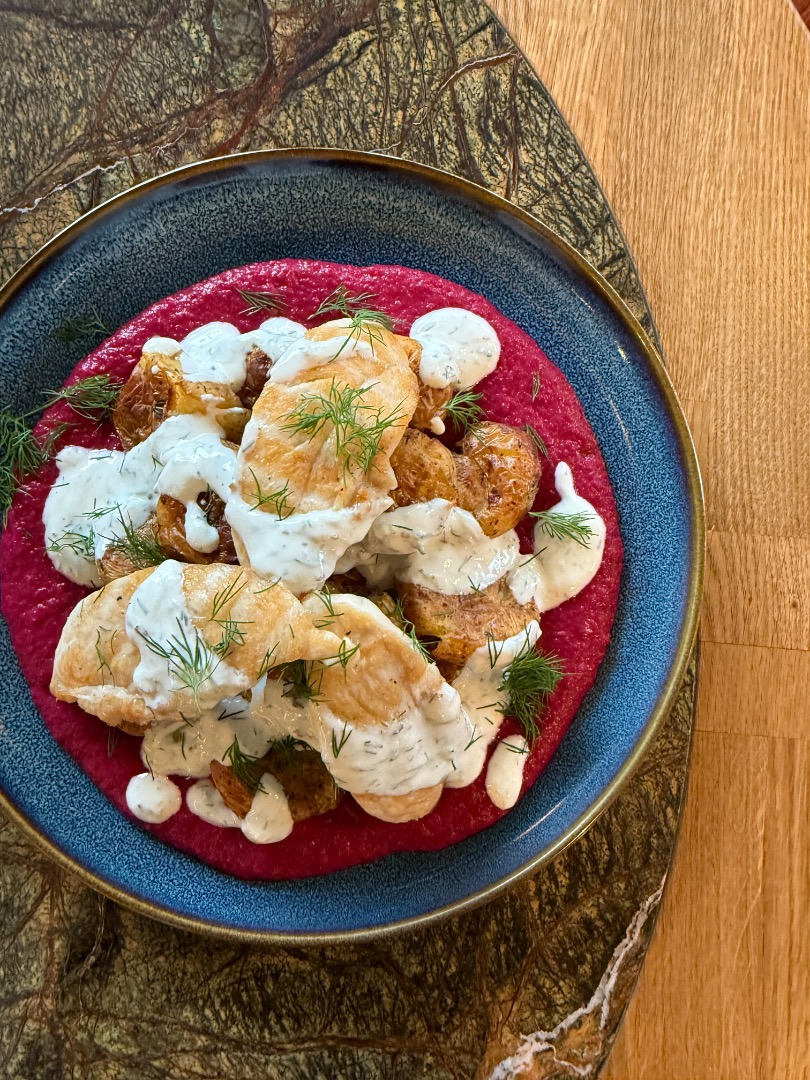 Kuracie prsia s cviklovo-fazuľovým pyré a pečenými zemiačkami