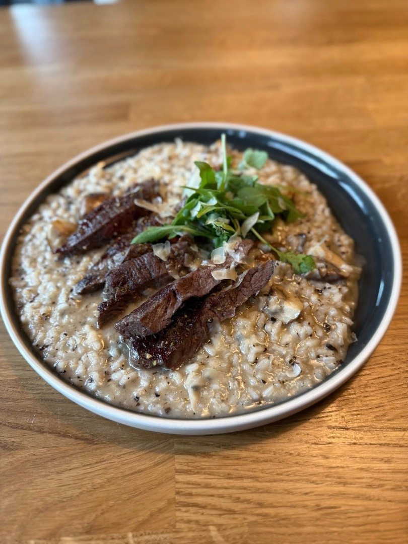Parmezánové rizoto so šampiňónmi a hľúzovkovým olejom, Striploin steak
