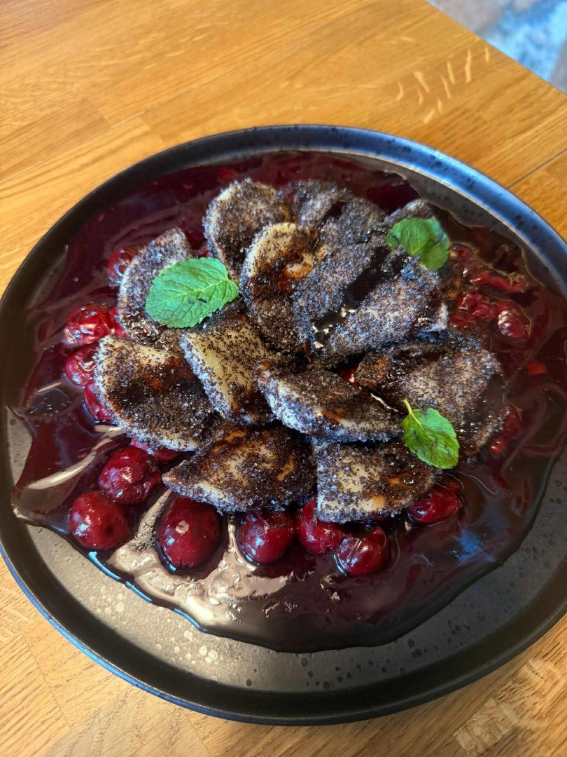 Kominárske slivkové pirohy s višňovým coulis a čokoládovou polevou
