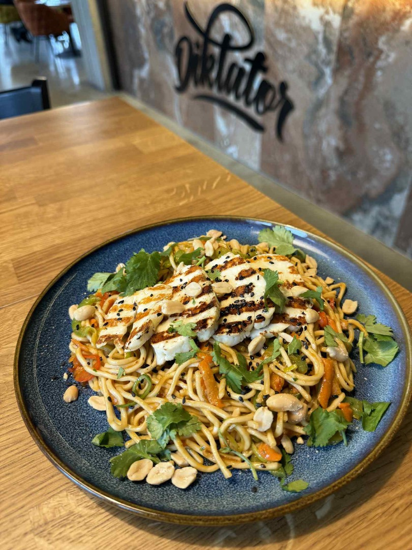 Chilli chrumkavé arašidové rezance s grilovaným Halloumi syrom