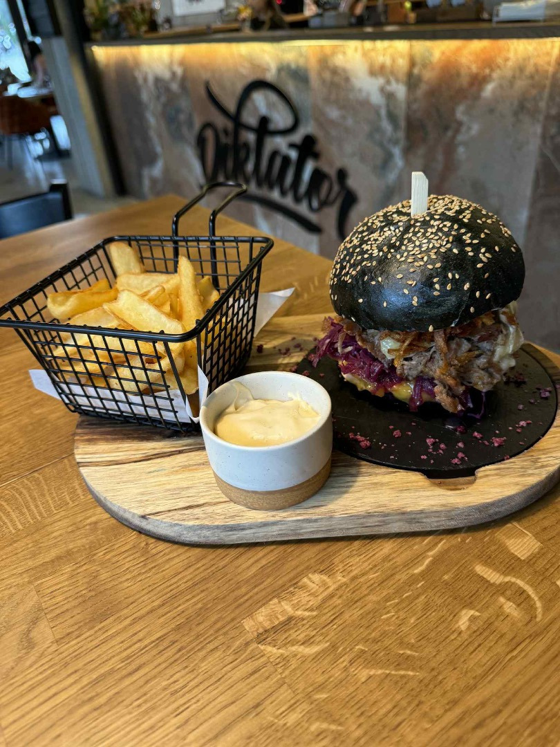 Duck burger – trhané kačacie mäso, pomarančovo-mangové čatní, červená kapusta, hermelín, slanina, zemiaková slama, hranolčeky, sweet chilli omáčka