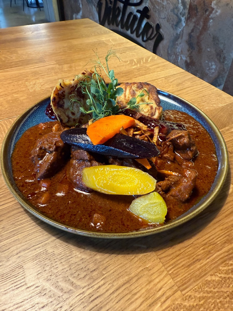 Divinový guľáš, karlovarská knedľa, brusnicový gél, zemiaková slama, pošírovaná mrkva